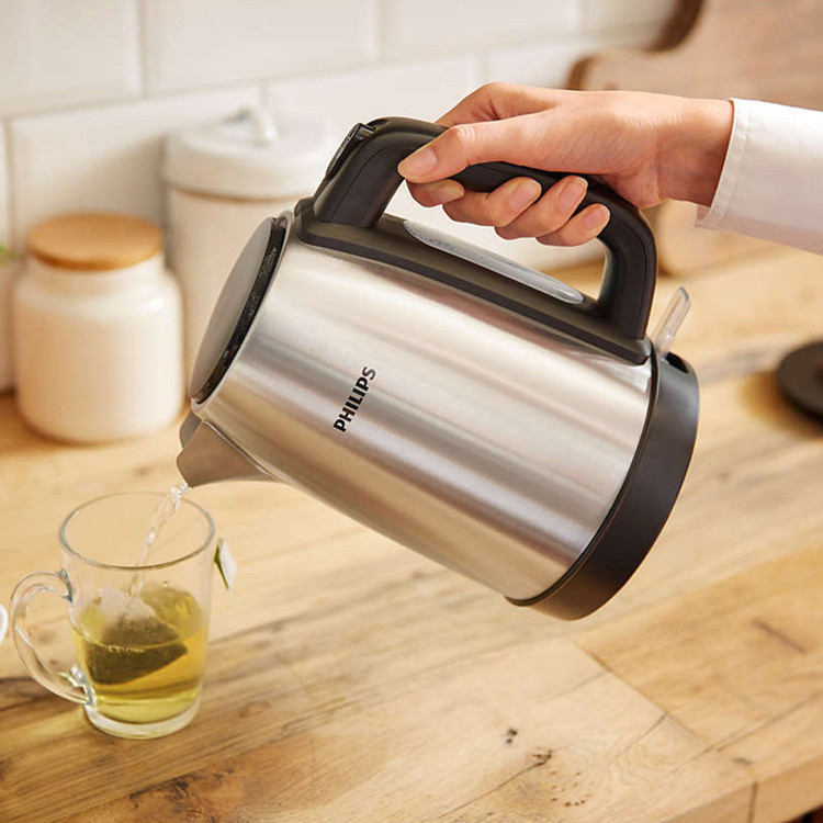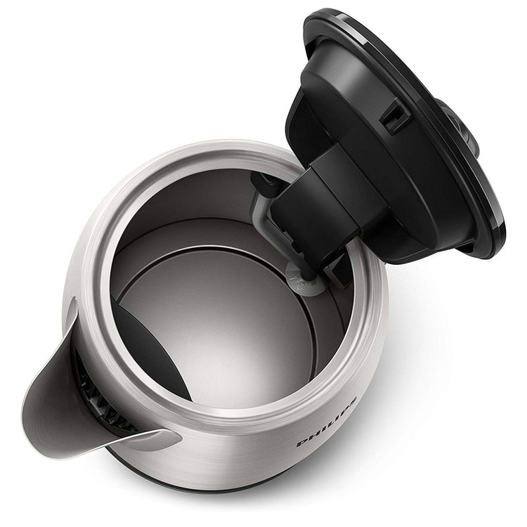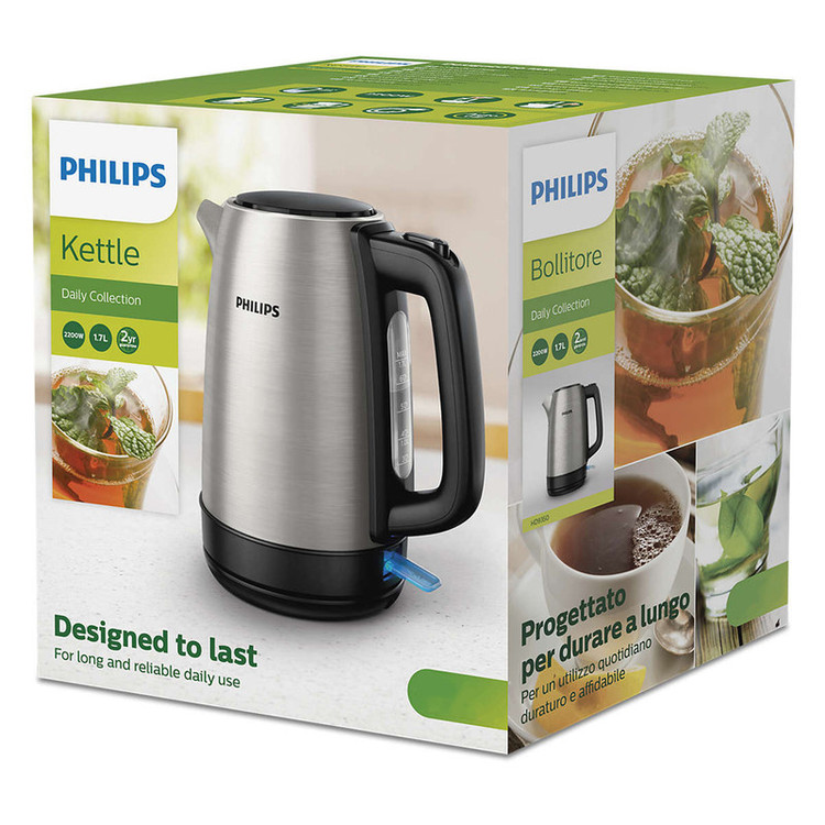 کتری برقی فیلیپس مدل HD9350 دارای بدنه ای از جنس استیل ضدزنگ است و طراحی زیبایی دارد. این کتری با داشتن شبکه های فیلتری کوچک، هر گونه رسوب را از آب میگیرد تا آب جوش آمده از کیفیت بالاتری برخوردار باشد. از نظر ایمنی نیز این محصول دو عملکرد مختلف دارد. قطع کن هنگامی که اب کمی در آن باشد و یا آب به جوش بیاید، عمل میکند و استفاده از آن را بی خطر و ساده می کند. در کتری برقی فیلیپس مدل HD9350 چراغ نشانگری برای نشان دادن روشن/خاموش بودن دستگاه تعبیه شده است. در کنار کتری نیز با وجود نشانگر میزان آب موجود در آن، قابل رویت می باشد. این کتری که توان 2200 واتی دارد، دارای حجم 1.7 لیتری میباشد و در زیر کفی 360 درجه ای آن، محفظه ای برای نگهداری سیم برق تعبیه شده است. در پایان قابل ذکر است که دستگیره این کتری، به صورت ارگونومیک طراحی شده است و هنگام استفاده از دست شما لیز نمیخورد.