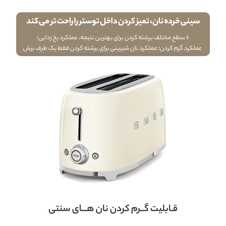 قابلیت تست 4 عدد نان تست، قابلیت گرم کردن نان های سنتی، دهانه ورودی بزرگ نان، سینی جداشو و قابل شستشو،