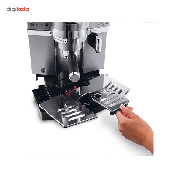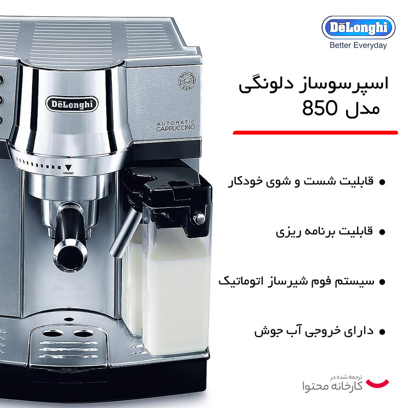 اسپرسوساز دلونگی مدل EC850M دستگاهی بسیار کاربردی و مدرن برای تهیه انواع قهوه با حفظ کیفیت است. این مدل با بهره گیری از توان طراحی شرکت معتبر دلونگی مشتریان این شرکت و خریداران این محصول را کاملا راضی نگه می دارد . این محصول مخزنی برای نگهداری دانه های قهوه ندارد و باید از قهوه آسیاب شده استفاده کرد. این مدل می تواند، اسپرسو و کاپوچینو آماده کند. تمام این امکانات از طریق پنل دسترسی دستگاه در اختیار مصرف کننده قرار می گیرد. مخزن آب در عقب دستگاه و مخزن شیر در جلوی دستگاه قرار دارد. سیستم ترموبلاک در این دستگاه در نظر گرفته شده است. فشار بخار 15 بار در این مدل باعث می شود تا قهوه به خوبی تهیه شود و کیفیت مقبولی داشته باشد. بدنه استیل اسپرسوساز دلونگی مدل EC850M علاوه بر استحکام زیبایی بخش آشپزخانه هم هست. طراحی دستگاه طوری است که محلی برای نگهداری فنجان ها هم در نظر گرفته شده است.مصرف انرژی این مدل بسیار پایین بوده و در رده انرژی A قرار می گیرد. دلونگی از برترین تولیدکنندگان دستگاه های اسپرسو و قهوه ساز دنیا است و اولین نام در این بازار است که به ذهن مشتریان می رسد.