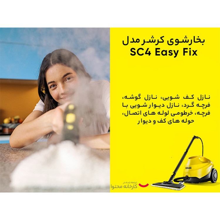 بخار شوی SC4 ایزی فیکس کارشر از جمله بهترین تولیدات این کمپانی در زمینه تولید بخارشوی است. این مدل برای تمیز کردن سطوح مختلف طراحی شده است و به خوبی میتواند محیط را عاری از هرگونه باکتری کند. همچنین نصب و جدا سازی حوله به نازل زمین در بخارشوی SC4 ایزی فیکس کارشر به راحتی و در کمترین زمان ممکن و بدون دخالت دست هم صورت میگیرد و چون مجهز به محفظه نگهداری سیم برق و محل قرار گیری لوازم جانبی است بسیاری از کسانی که دوست دارند از بخارشوی در نظافت منزل استفاده کنند بر روی این مدل از بخارشوی کارشر همنظر هستند. 2 هزار وات توان حرارتی، 3.2 بار قدرت پرتاب، شلنگ 2 متری،سیم 4 متری، مخزن یدکی، سیستم رسوب زدایی، سوپاپ اطمینان، کنترل جریان بخار و... از جمله مشخصات این مدل است که با مقایسه آن با سایر مدلهای کارشر کاربر را میتواند به این نتیجه برساند که در انتخاب خود اشتباه نکرده است و یکی از بهترین گزینههای بخارشوی کارشر را با خود به خانه میبرد.