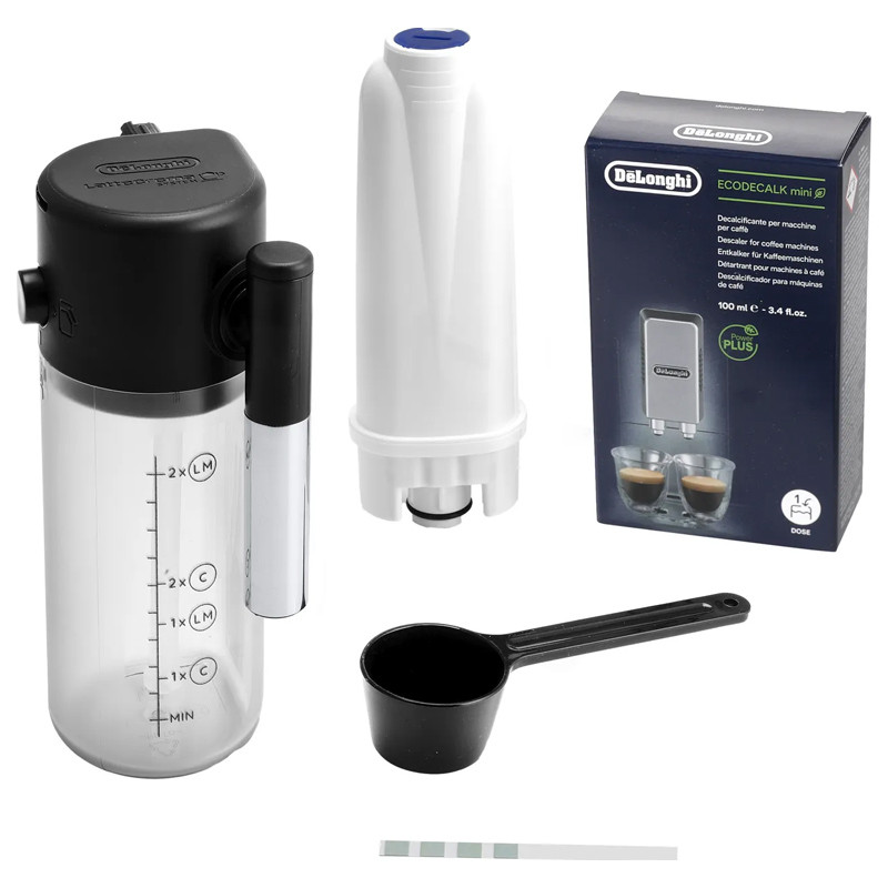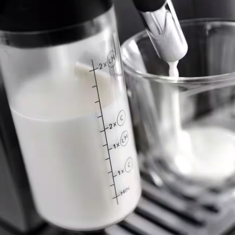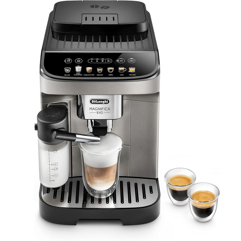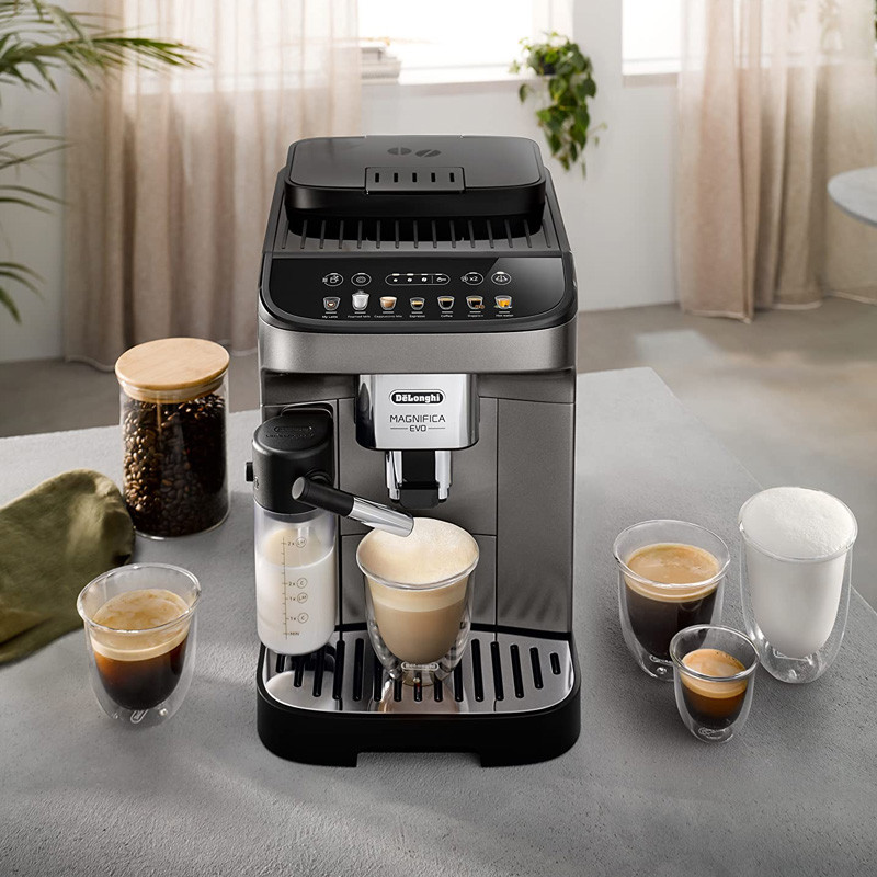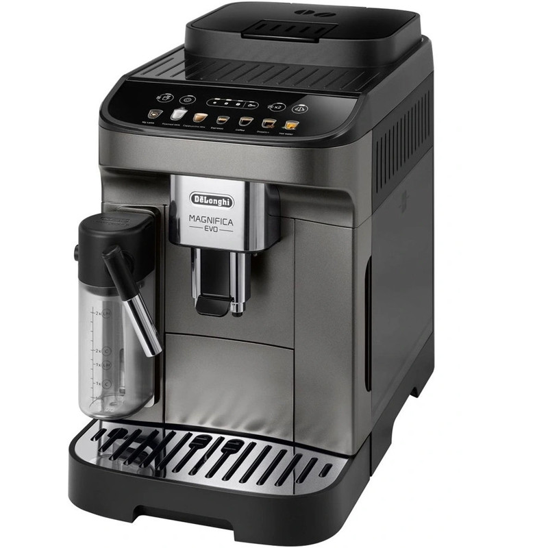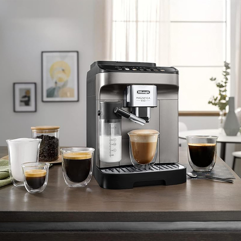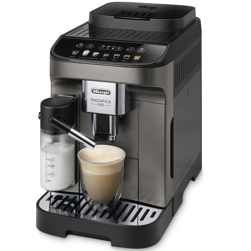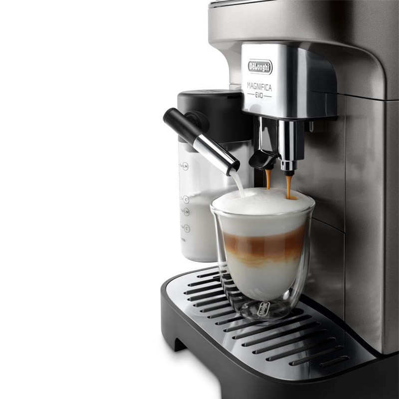 اسپرسوساز اتوماتیک دلونگی مدل Magnifica Evo ECAM 290.83 یکی از محصولات شگفت انگیز برند دلونگی بوده که به صورت کاملا اتوماتیک طراحی شده است. جنس بدنه دستگاه ترکیبی از پلاستیک مرغوب و استیل می باشد که میزان درخشندگی آن بسیار بالا است. همچنین دارای یک پنل لمسی بوده و با کمک 7 دستور برنامه ریزی شده در دستگاه قادر خواهید بود به کمک پودر قهوه و مخزن شیر انواع نوشیدنی های با شیر و بدون شیر را بدون دخالت دست و فقط با لمس یک گزینه تهیه کرده و مزه واقعی قهوه را بچشید. همچنین اسپرسوساز تمام اتوماتیک دلونگی ECAM 290.83 دارای سیستم منحصر به فرد لاته کرما بوده که بافت پر چربی از شیر را برای انواع لاته و کاپوچینو مهیا می کند. توان ورودی دستگاه دلونگی اکثر دستگاه های تمام اتوماتیک به دلیل دارا بودن سه مخزن مجزا آب، شیر و آسیاب قهوه و همچنین تولید فشار بخار آب بالا و مکانیزم ترموبلاک باید دارای توان زیادی باشند. اسپرسوساز 290.83 هم یکی از این موارد بوده که مهندسین برند دلونگی توان 1450 وات را برای آن طراحی کرده اند. این میزان توان باعث به جوش آمدن سریع آب برای تهیه عملیات قهوه و همچنین تولید فشار بخار بالا در سریع ترین زمان ممکن می شود. مخزن مجزا برای آسیاب قهوه بسیار پر اهمیت می باشد. اگر دستگاهی چنین مخزنی داشته باشد کار تولید اسپرسو بسیار راحت تر شده و طعم قهوه به 100 درصد خود نزدیک می شود. اسپرسو ساز دلونگی مدل ایکام 290.83 دارای یک مخزن 250 گرمی کوچک بوده و با کمک سنگ های نوع مخروطی قهوه را در اندازه های کاملا یکسان پودر و خرد می کند. همچنین با تنظیم درجه آسیاب می توانید تا 13 حالت قهوه را پودر نمایید. زیرا هر چقدر قهوه دارای درجه پودر پذیری بیشتری شود، غلظت و مزه آن افزایش یافته و بیشتر مزه قهوه را درک می کنید.