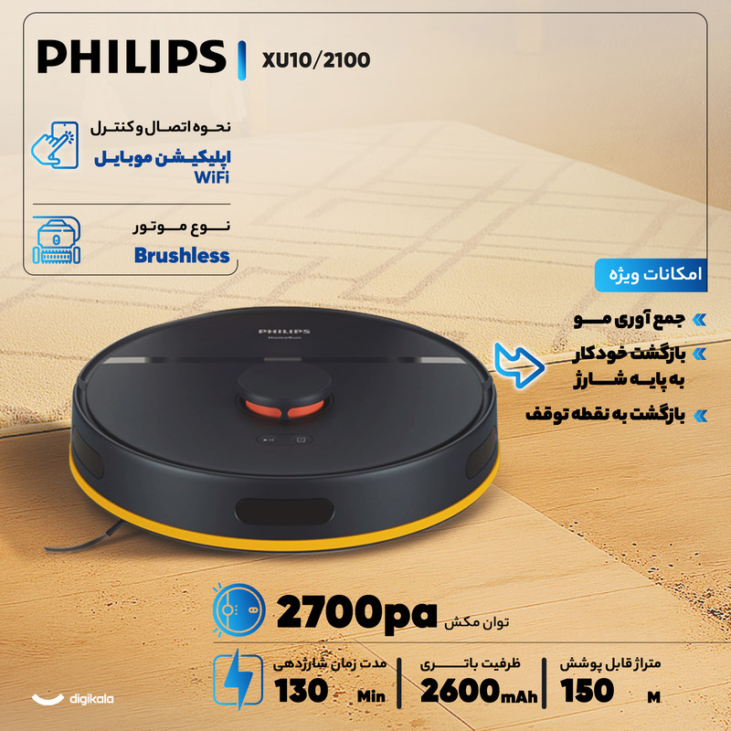 جاروبرقی رباتیک فیلیپس مدل XU2100/10 با ابعاد ۳۴۵x۳۴۵x۹۷ میلیمتر و وزن ۳.۱ کیلوگرم، یک دستیار هوشمند و کارآمد برای نظافت منزل شماست. این جارو رباتیک با توان مکش ۲۷۰۰ پاسکال و موتور براشلس (Brushless)، به راحتی گردوغبار را از سطوح مختلفی مانند پارکت، لمینت، سرامیک، شیشه و فرش جمعآوری میکند. صدای عملکرد آن تنها ۶۶ دسیبل است و فیلتر خروجی HEPA 11 نیز به تصفیه هوای خروجی کمک میکند.