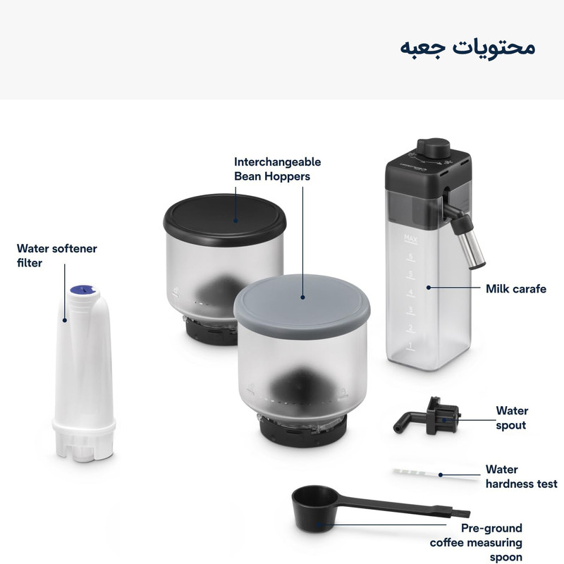 سیستم آسیاب دانه قهوه مجهز به 2 مخزن 250 گرمی دانه قهوه است که در بالای دستگاه نصب شده و میتوانید دو نوع دانه را در آن نگهداری کرده و امکان آسیاب دانههای قهوه را با 14 حالت مختلف به شما میدهد. با این 14 حالت مختلف و قطعات سرامیکی میتوانید متناسب با نوع نوشیدنی که میخواهید آماده کنید، دانههای قهوه را به بهترین شکل آسیاب کنید.