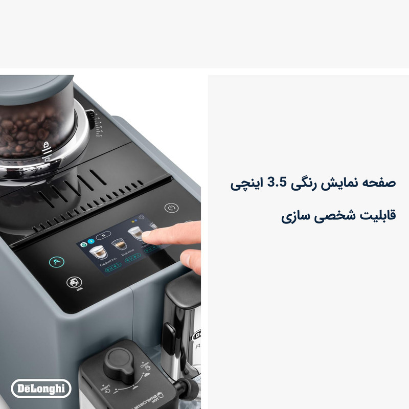 این اسپرسوساز دارای صفحه نمایش لمسی 3.5 اینچی با آیکونهای رنگی است که به شما امکان میدهد تنظیمات مختلف دستگاه را به راحتی انجام دهید. صفحه نمایش ساده و تعاملی به شما امکان دسترسی مستقیم و آسان به تمام نوشیدنیهای مورد علاقه شما، از اسپرسو گرفته تا کاپوچینو، لاته ماکیاتو را میدهد و پروفایلهای مربوط به هر نوع نوشیدنی را برای ذخیره و استفاده آسان در آینده، به راحتی شخصی سازی کرده و به شما کمک میکند تا در تهیه نوشیدنیهای مختلف در زمان خود صرفهجویی کنید.